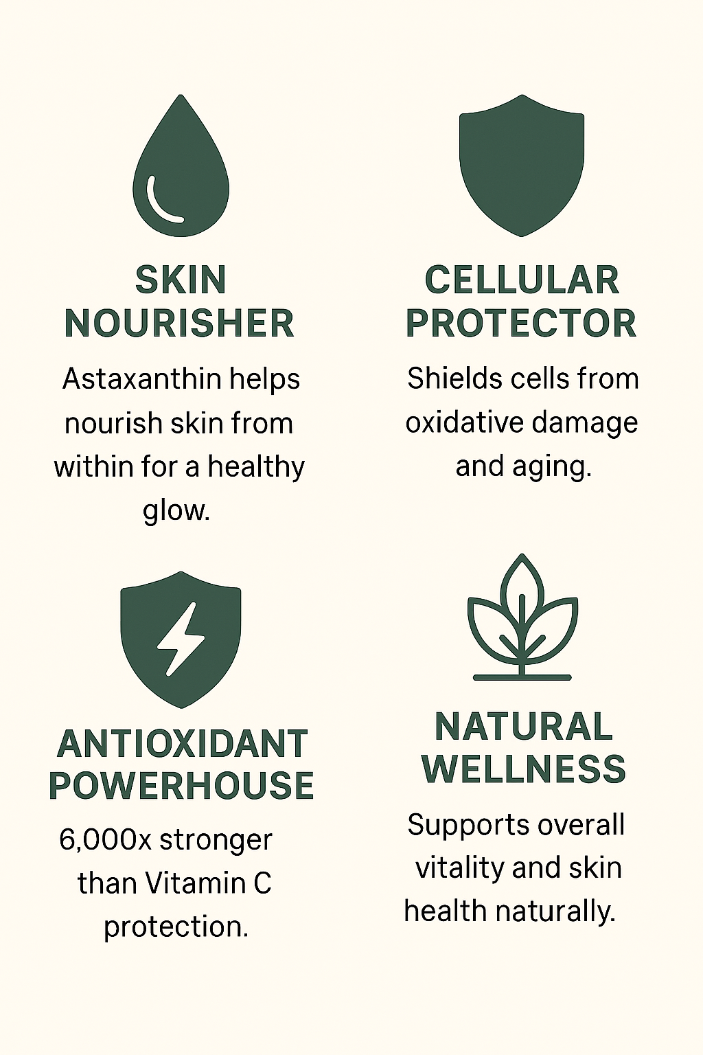 The star of our formula. This naturally-sourced astaxanthin provides 6,000 times the antioxidant power of vitamin C and 500 times that of vitamin E. Unlike synthetic versions, our microalgae-derived astaxanthin has the same molecular structure found in wild salmon and delivers superior bioavailability.